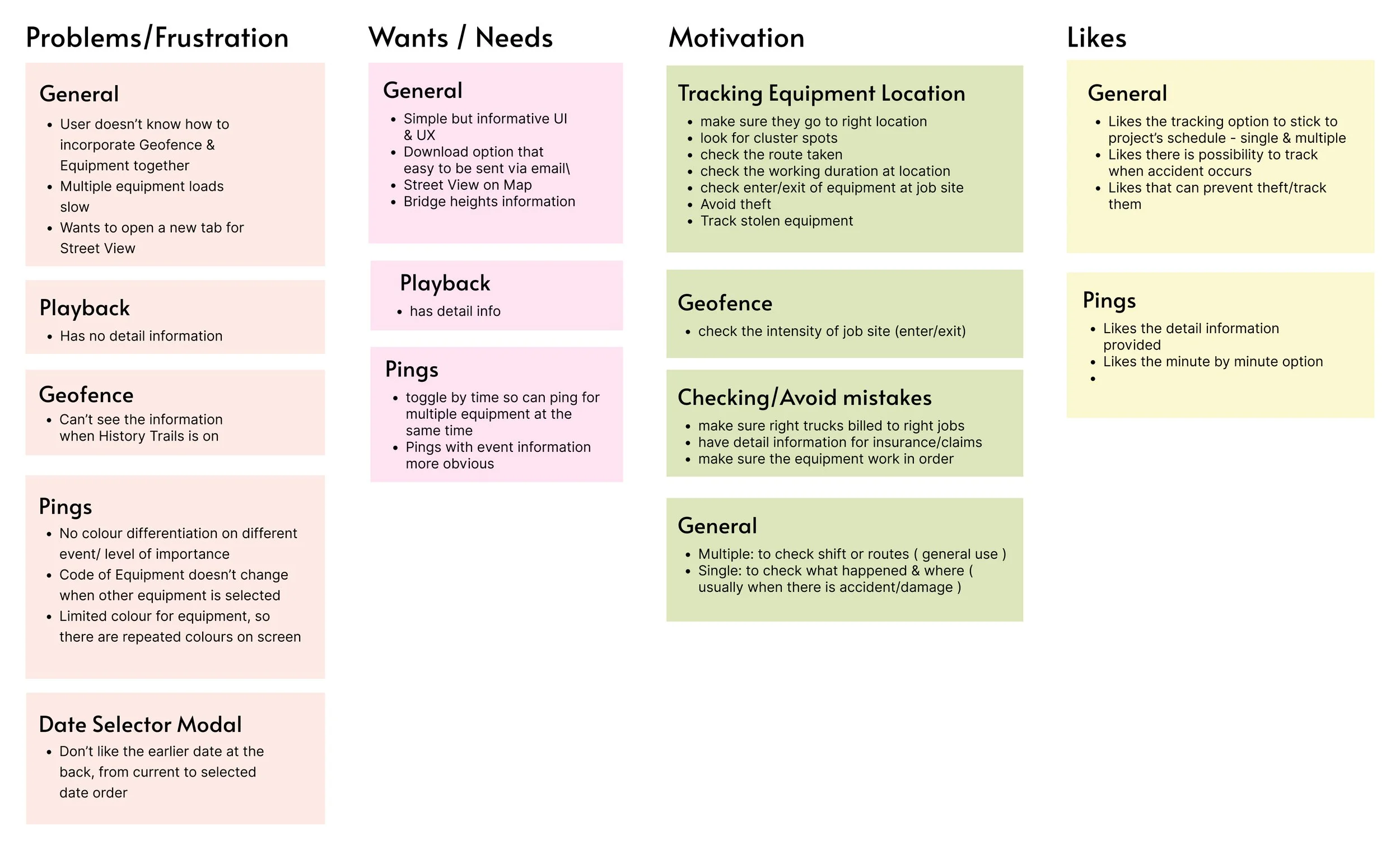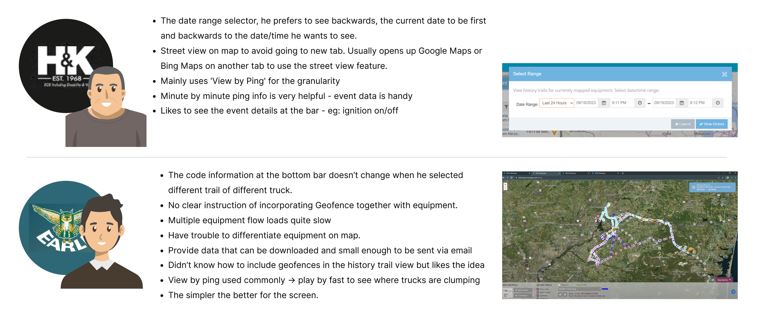 I conducted user interviews to have a better understanding of the problems, wishes and motivations for the feature. I had two interviews with a Fleet Manager from H&K Construction and Logistic Analyst from Earle Construction. Check some of the findings below:
