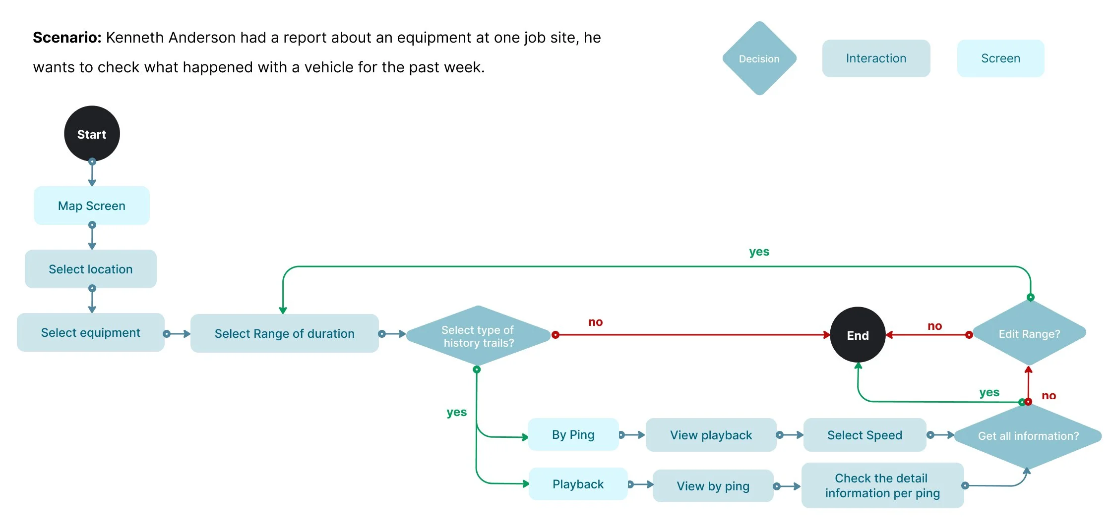 I designed the new History Trails feature based on feedback gathered from discovery interviews and collaborated with stakeholders to prioritize requirements. The updated design allows users to track multiple pieces of equipment on the map, including geofence locations, with the ability to easily edit these areas. A significant improvement is the addition of a feature that enables users to create temporary areas on the map, allowing them to see which equipment was involved in a specific location.