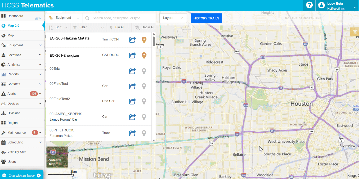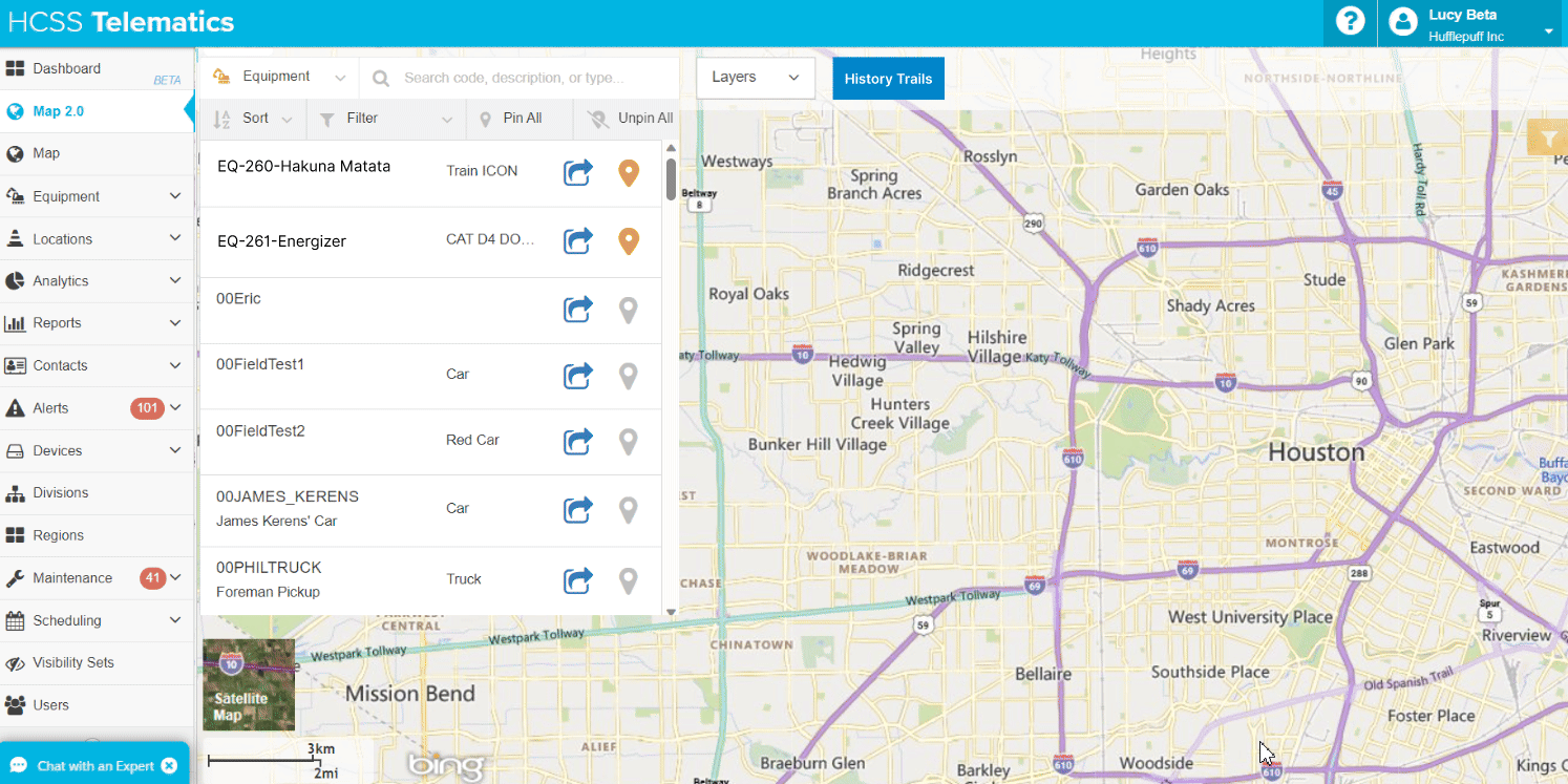 The current History Trails feature is outdated and has limitations in tracking equipment. It only functions when users select specific equipment, but customer feedback indicates a desire for additional features, such as location options and temporary locations. Additionally, the map interaction is not user-friendly, with some buttons not working properly. The feature currently uses Bootstrap components, but we aim to transition to React and incorporate the new HCSS UI Design System for a more modern, sleek, and effective interaction.