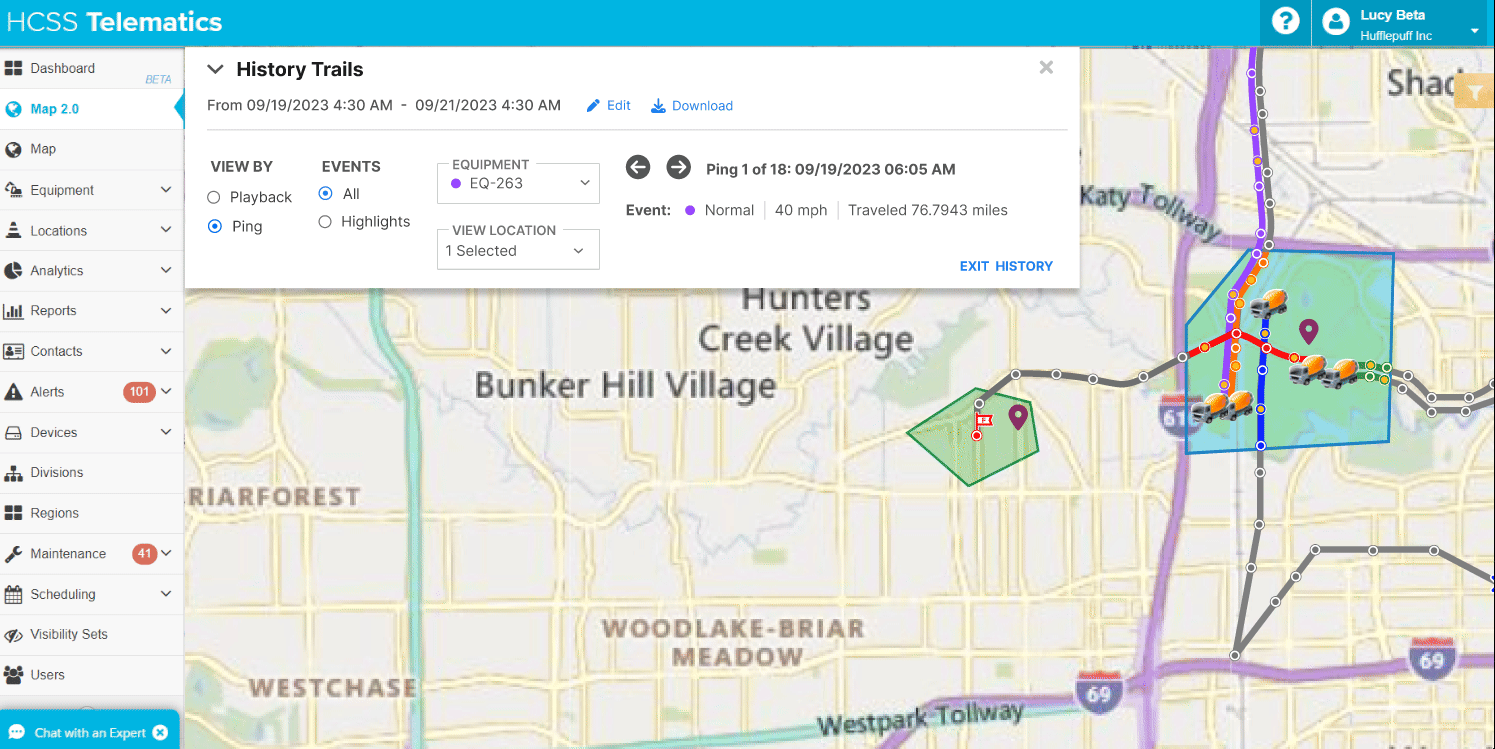 History Trails Result Map: This displays the result of the data pulled based on the user's selection. The map is interactive, allowing users to access detailed information based on selected pings, locations, or equipment.